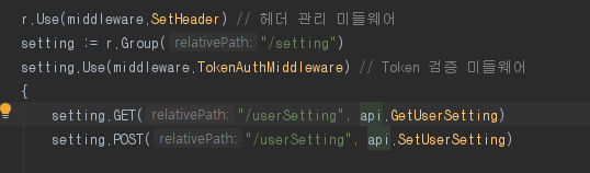 저는 setting이라는 그룹을 만들어서 이부분에만 Token 검증 미들웨어를 적용시켰는데요